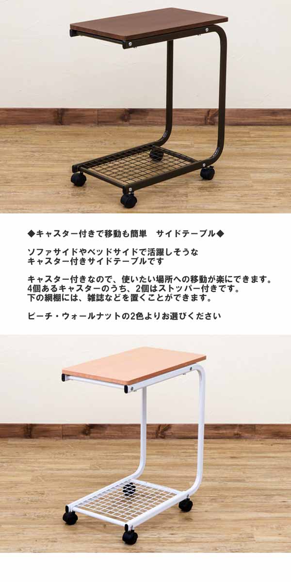 ○カラー:ビーチ(BE) ウォールナット(WAL) ○サイズ:(W)幅30(37.5)cm×(D)奥行き50cm×(H)高さ60cm ※()内はキャスター最大値 天板の厚み:約15mm 天板耐荷重:約5kg 網棚:約3kg ○材質 天板:合成樹脂化粧繊維板 フレーム、網棚:スチール(エポキシ粉体塗装) キャスター4個付(内2個はストッパー付) ○重量:4.2kg ○組立家具 ○沖縄県配送不可キャスター付サイドテーブル