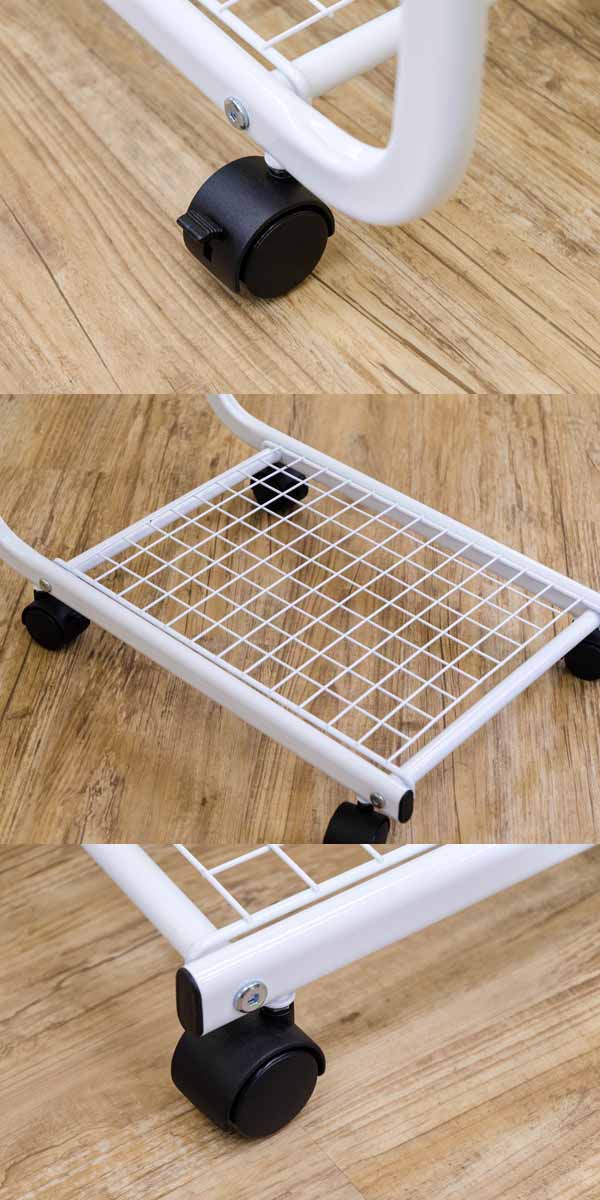 キャスター付きの本体は物をのせたままでもスムーズに動かせて便利! 天板の下には網棚もついているので、用途に応じた使い分けができますね。